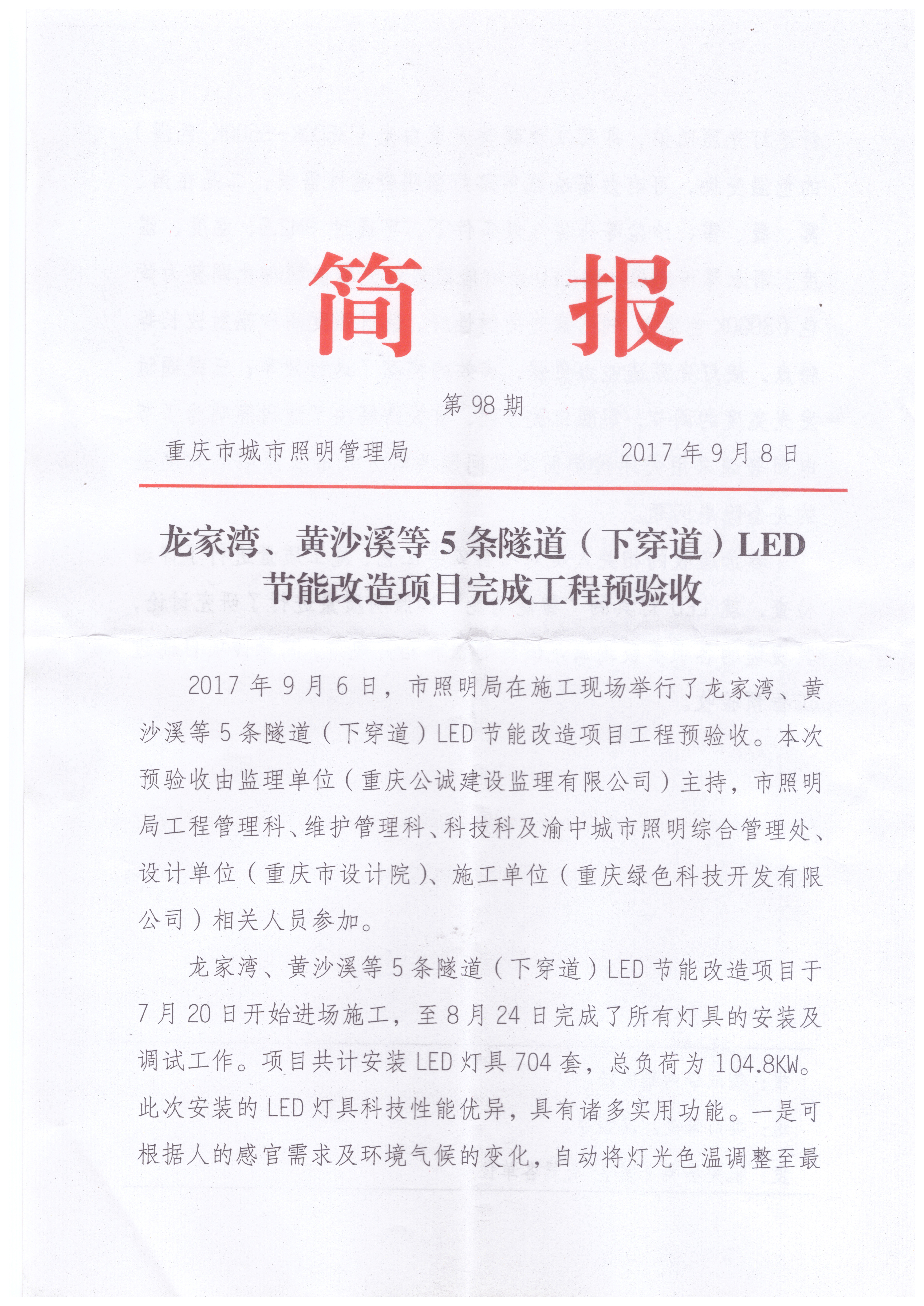 2017年7月31日,我司使用“中國創(chuàng )造”“互聯(lián)網(wǎng)+”多色溫防霧霾LED全智能路燈在重慶市龍家灣、黃沙溪、袁家崗、鵝嶺、陳家坪隧道實(shí)施科技節能改造工程已全面竣工。2017年9月6日,該項目建設單位重慶市城市照明管理局、監理公司及設計公司對該項目進(jìn)行了現場(chǎng)預驗收,參會(huì )人員對該創(chuàng )新專(zhuān)利產(chǎn)品作出了極高的評價(jià)。會(huì )后,重慶市城市照明管理局專(zhuān)門(mén)印發(fā)了《龍家灣、黃沙溪等5條隧道(下穿道)LED節能改造項目完成工程預驗收》簡(jiǎn)報(附后),其上級主管部門(mén)重慶市城市管理委員會(huì )對其進(jìn)行了新聞報道。