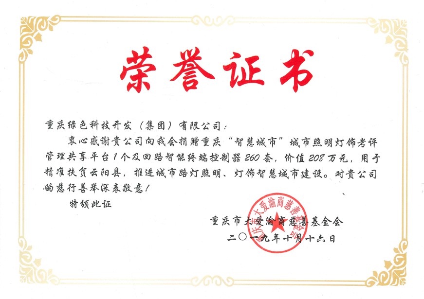 10月16日,重慶綠色科技開(kāi)發(fā)(集團)有限公司為支持國家級重點(diǎn)貧困縣精準扶貧工作,積極推進(jìn)智慧城市建設,通過(guò)重慶市大愛(ài)渝商慈善基金會(huì ),向云陽(yáng)縣市政設施管理所捐建了回路智能終端控制器260套,以及配套建設重慶“智慧城市”城市照明燈飾四級考評管理共享平臺1個(gè),總價(jià)208萬(wàn)元,用于解決云陽(yáng)縣城市路燈照明智能化管理的問(wèn)題,幫助云陽(yáng)縣實(shí)現市政府在《重慶市城市綜合管理提升行動(dòng)方案》提出的城市照明“一把閘刀”管理的要求。