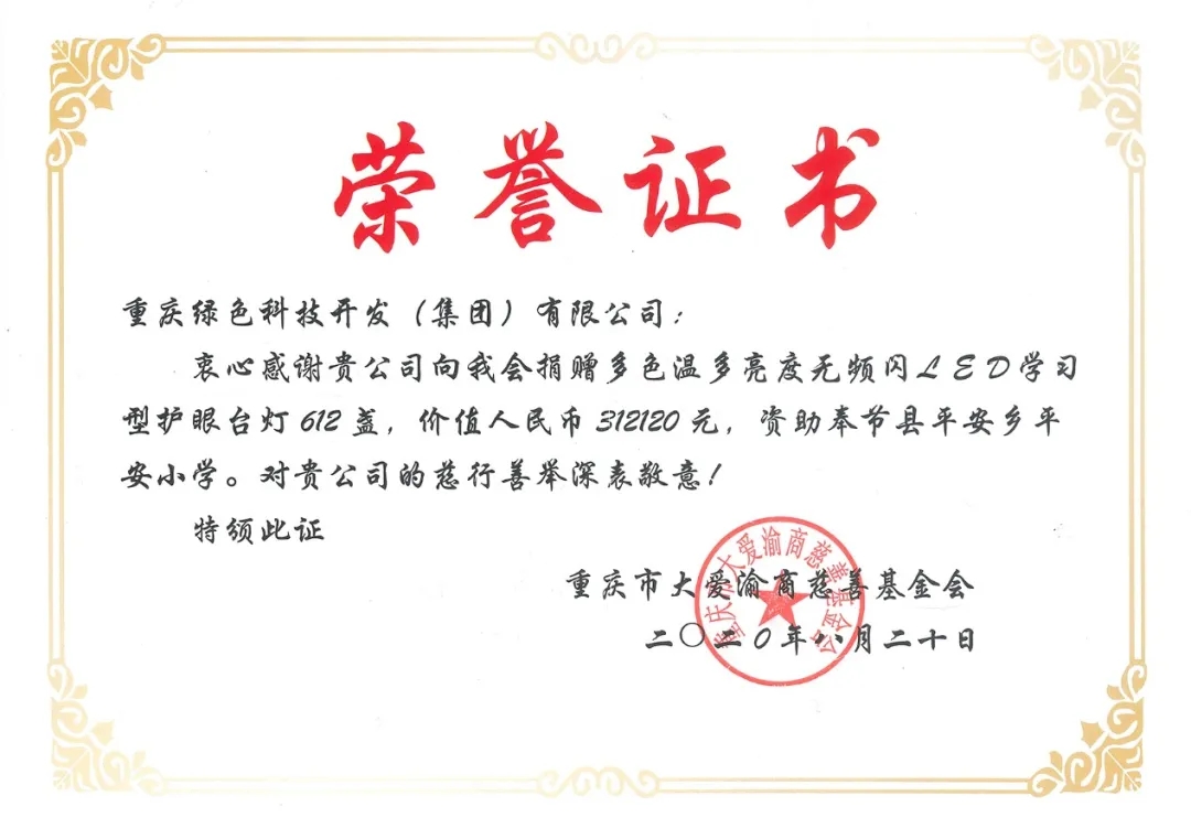 2020年8月5日,重慶綠色科技開(kāi)發(fā)(集團)有限公司支持國家級重點(diǎn)貧困縣精準扶貧工作,通過(guò)重慶市大愛(ài)渝商慈善基金會(huì ),向奉節縣平安鄉平安小學(xué)捐贈多色溫多亮度無(wú)頻閃LED學(xué)習型護眼臺燈612盞、太陽(yáng)能智慧燈桿4套,總價(jià)值36.2萬(wàn)元的愛(ài)心物資,助力脫貧攻堅。